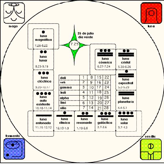 Este nuevo Calendario (o Sincronario) tiene la forma de una `Onda Encantada', ya que al tiempo cuatridimensional se le puede graficar como una espiral. Está conformado por 13 meses (o Lunas) de 28 días (13 x 28 = 364, más un día libre o `día verde', lo que totaliza los 365 días del año solar). Una Luna está compuesta por 4 semanas perfectas de 7 días.